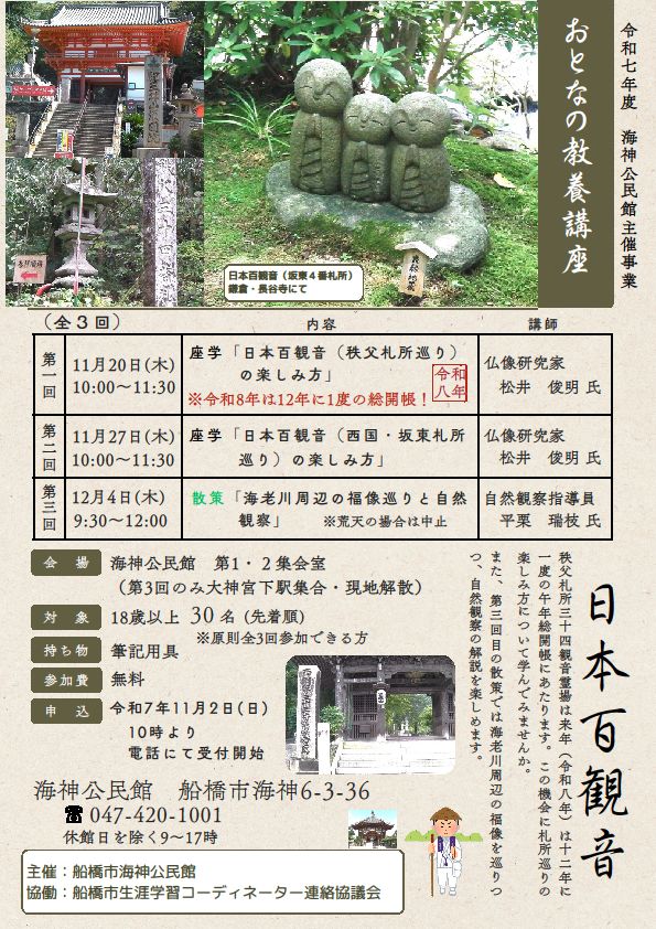 11/2 10時より 電話で海神公民館へ申込 047-420-1001