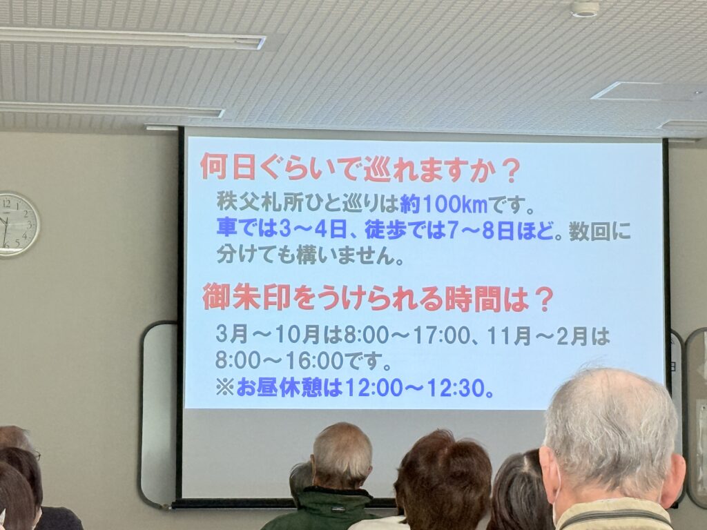 第一回11月20日 秩父札所巡り:札所は霊場寺院のことで、平安時代に修行僧が観音霊場を巡るようになり、人々に広まっていきました。秩父は、江戸時代に出開帳を行い、札所巡りが知られるようになりました。江戸に近い四萬部寺が一番札所に。開創時三十三ケ所から三十四ケ所となり日本百観音として定着しました。全行程約100キロと巡るには良い距離です。