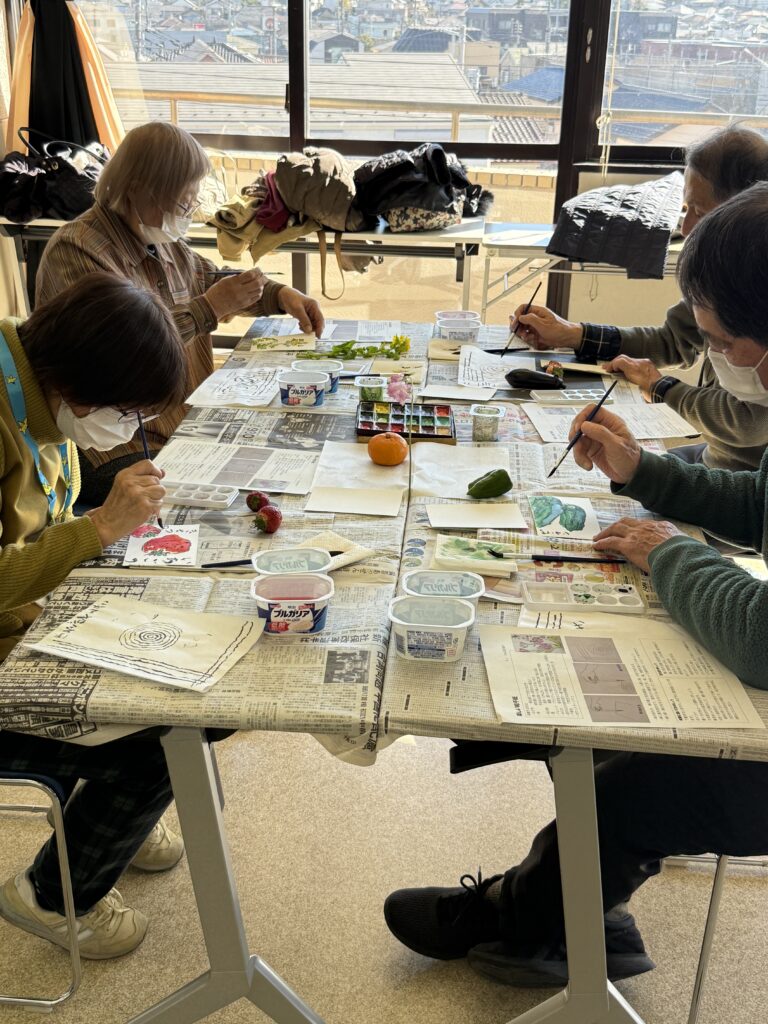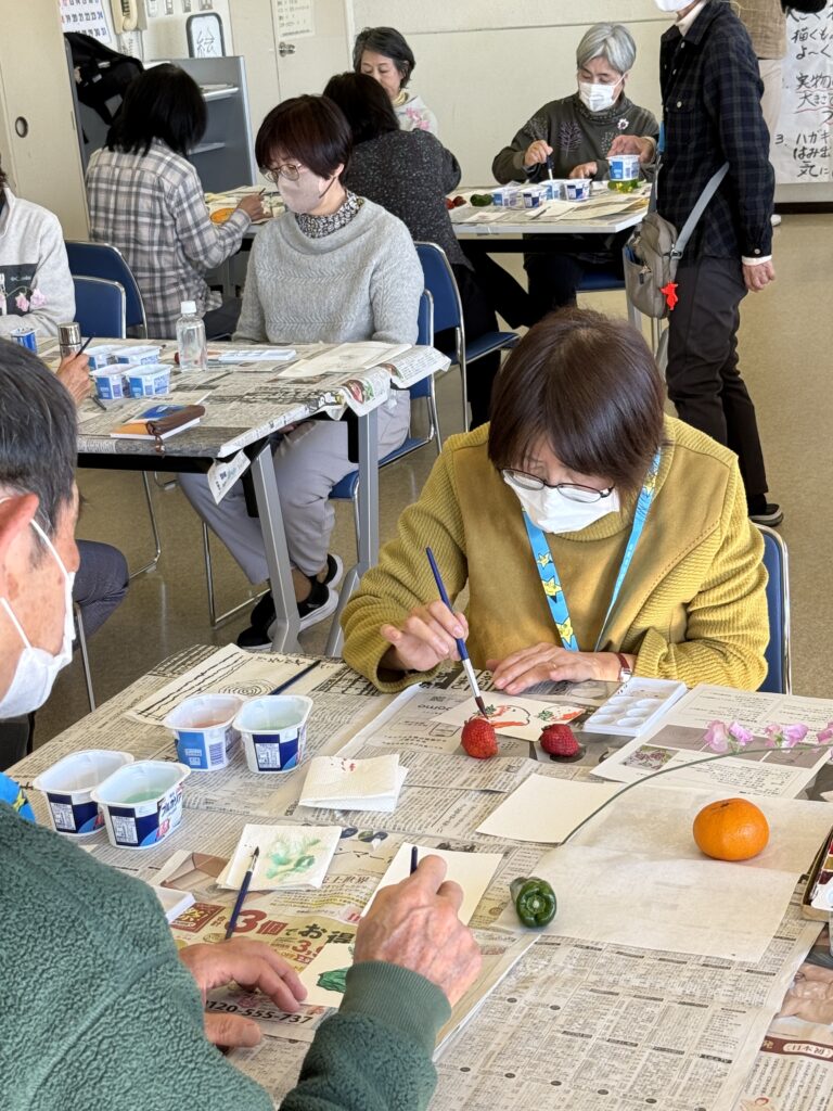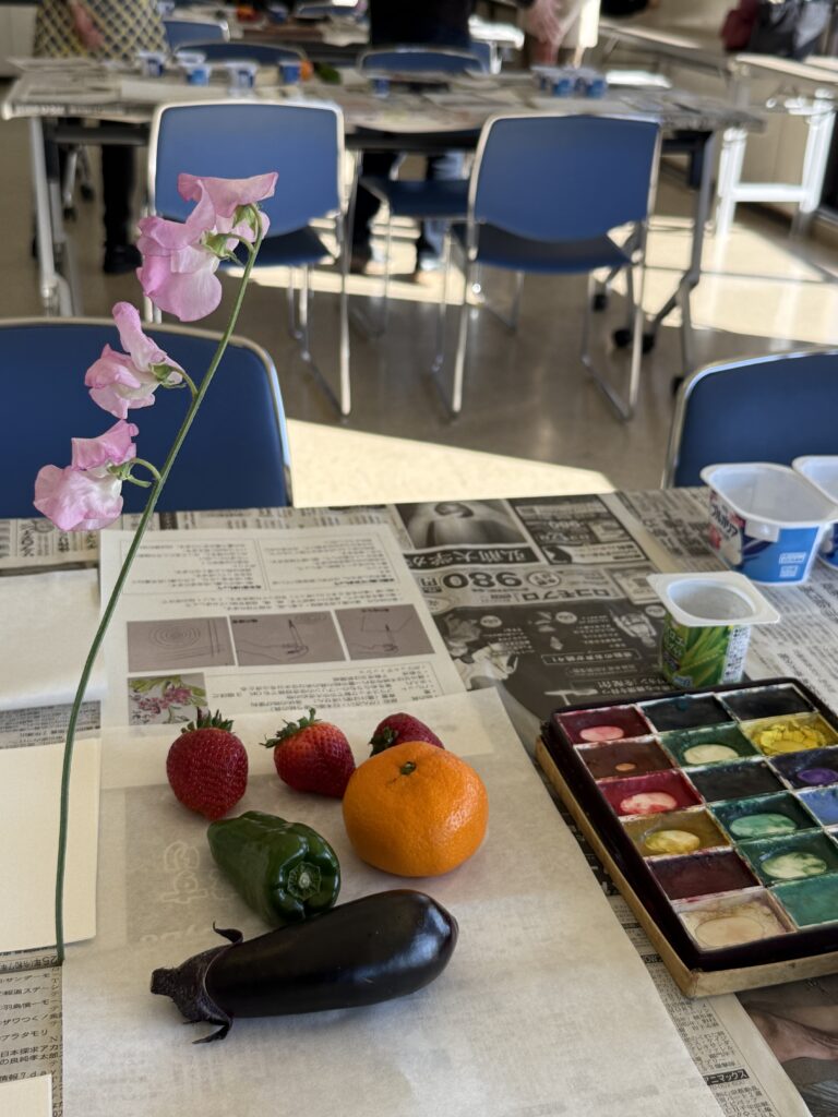 新聞紙を引いた机の上には、絵手紙用のはがき2枚、筆2本、小さなパレット、練習用の半紙、筆洗い用のヨーグルトのカップが一人ずつ用意され、輪郭を描くための青墨、色つけ用の顔料のセットがグループごとに用意されました。そして苺、みかん、なす、ピーマン、スイトピー、菜の花と季節を感じさせてくれるような色とりどりの題材が机の上に並んでいました。それだけでもう、わくわくします。