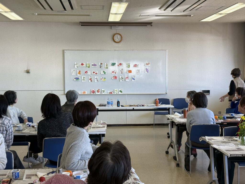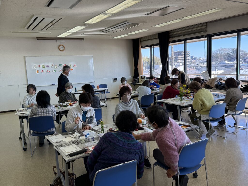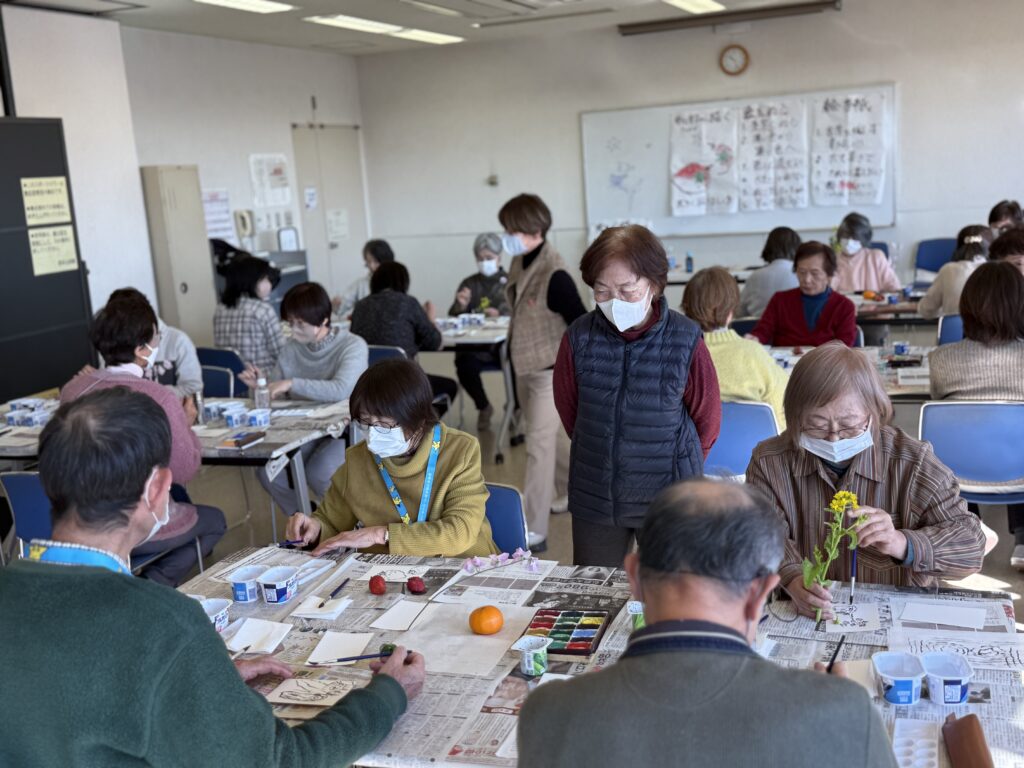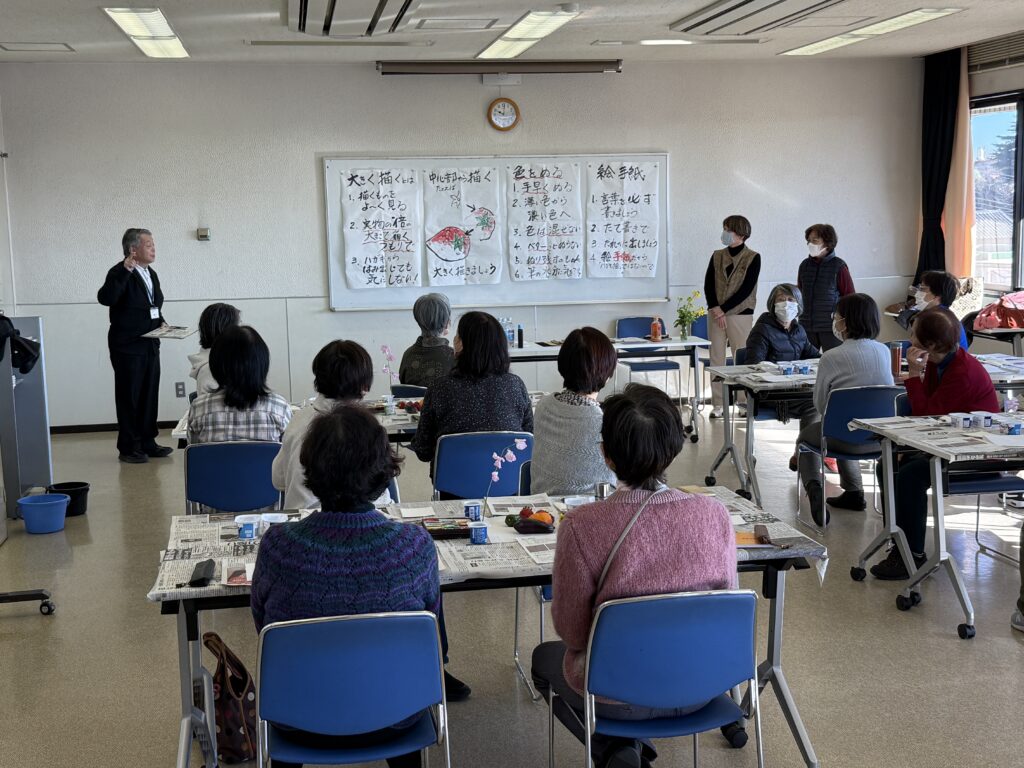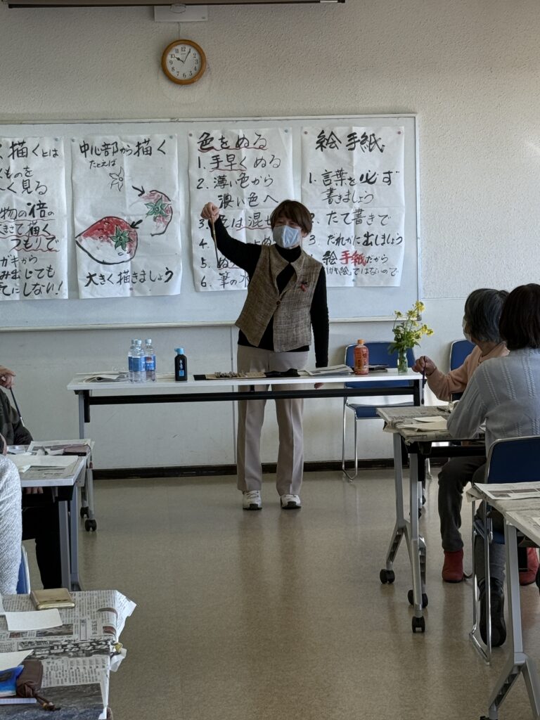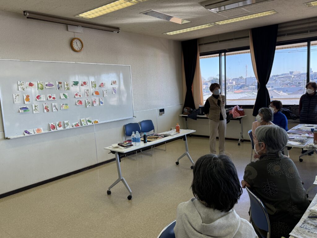 講師は宮本公民館で絵手紙サークルの講師をされている、小山田利津子先生。サークルの代表の方もお手伝いに来てくださいました。