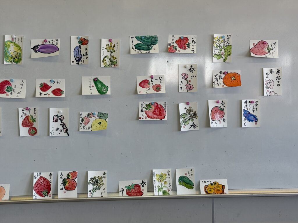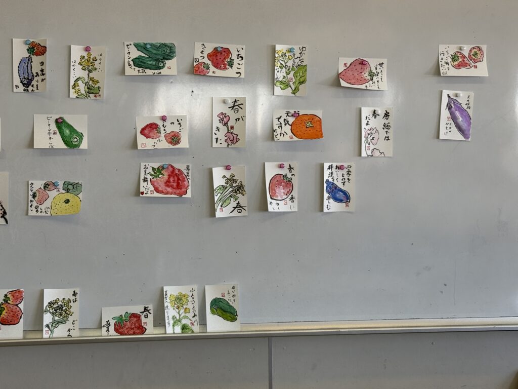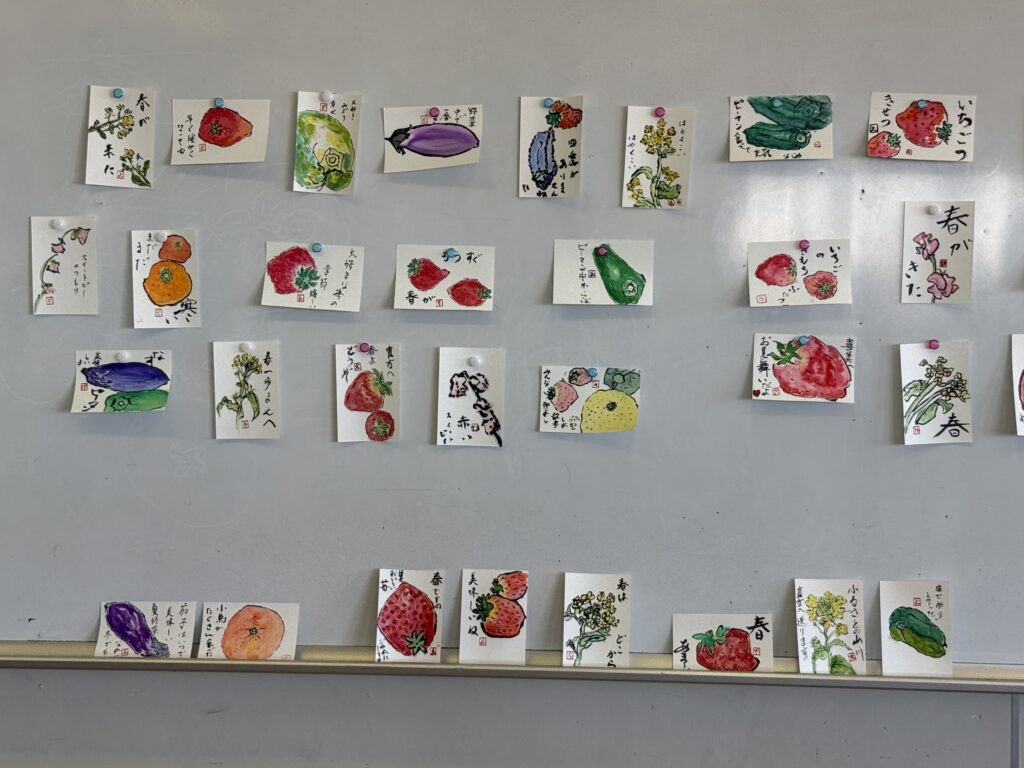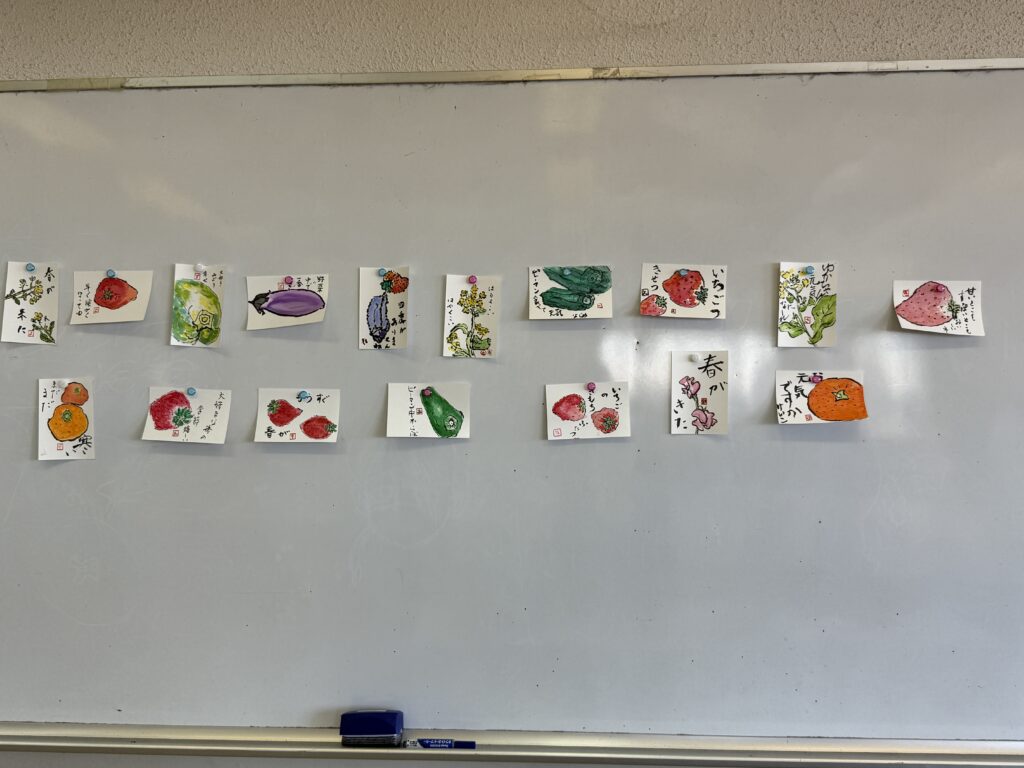 もう一枚も違う題材で作成し、最後に皆さんの作品を前に貼って鑑賞しました。どれもはじめてとは思えないような素敵な、でもちょっと素朴なとても味のある作品ばかりでした。